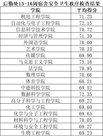 根据学校工作安排,后勤管理处组织公寓管理人员开展崂山、四方校区13-16周宿舍安全卫生秩序检查。本次共检查宿舍9249间,经统计,合格及以上宿舍9006间,不合格宿舍243间。各学院平均得分如下所示。