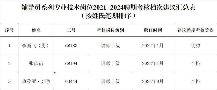 根据《关于做好学校2021-2024聘期工作人员考核工作的通知》,经个人填报、党委学生工作部聘期考核工作小组考核,对被考核人员提出考核档次建议,现予以公示,公示期为7月28日-7月30日。