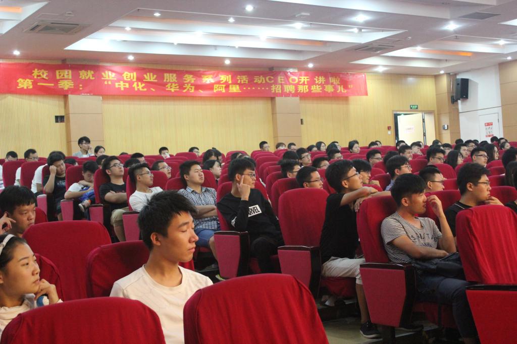 为更好的应对毕业生求职季,做好送指导、送服务工作,学校大学生就业指导中心启动了“校园就业创业服务活动——CEO开讲啦”,第一季主讲嘉宾邀请到了北京易招贤信息科技有限公司CEO左洪亮先生,为2018届毕业生现场开讲,主题是“中化、华为、阿里……招聘那些事儿”。