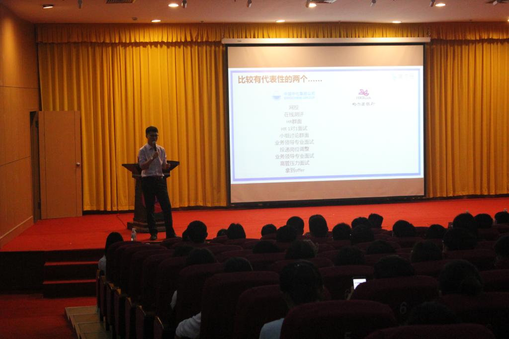 他分享了自己亲身参加中化集团、哈尔滨银行招聘的经历,介绍了企业招聘、职业辅导、人才评价、职业能力提升等工作中的经验,讲解了为京东、国家电网、中国人寿、万科地产、中国国航等企业提供招聘、能力评价和提升方面深度服务的情况,并与同学进行了现场互动。