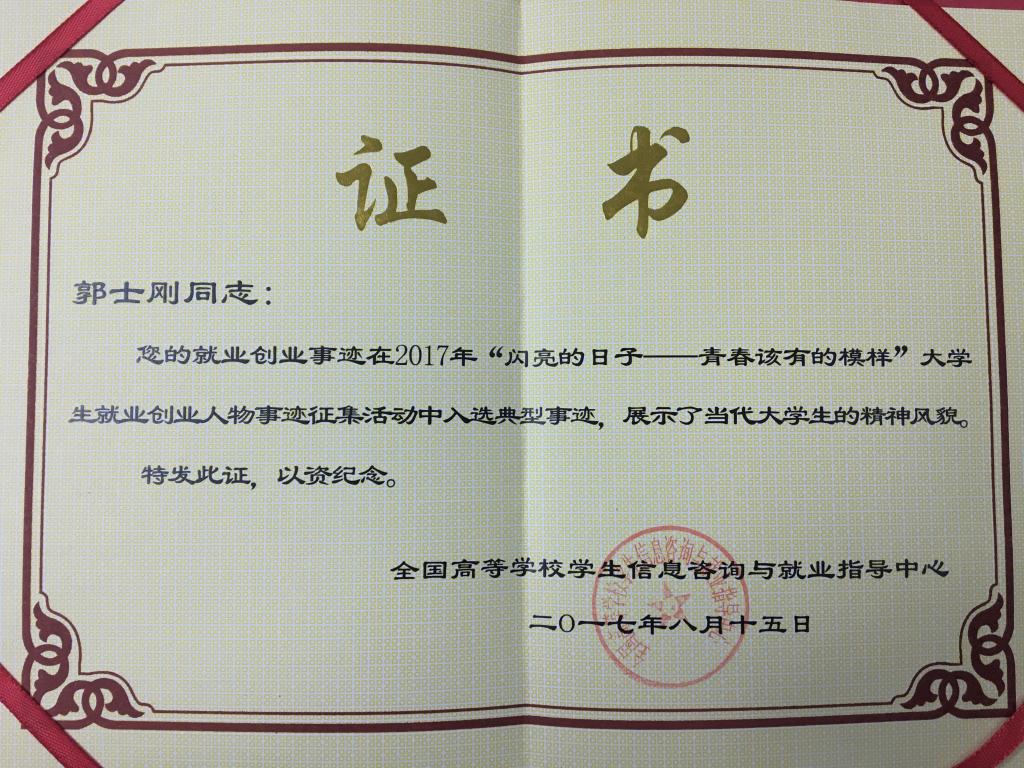 日前,由教育部全国高等学校学生信息咨询与就业指导中心组织开展的“闪亮的日子——青春该有的模样”大学生就业创业人物事迹评选活动结果揭晓。天游官网2017届毕业生郭士刚荣获“闪亮的日子—青春该有的模样”大学生创业典型人物。在此次大学生就业创业人物典型事迹评选活动中,全国共评选出大学生创业人物57人,其中,山东省入选5人。