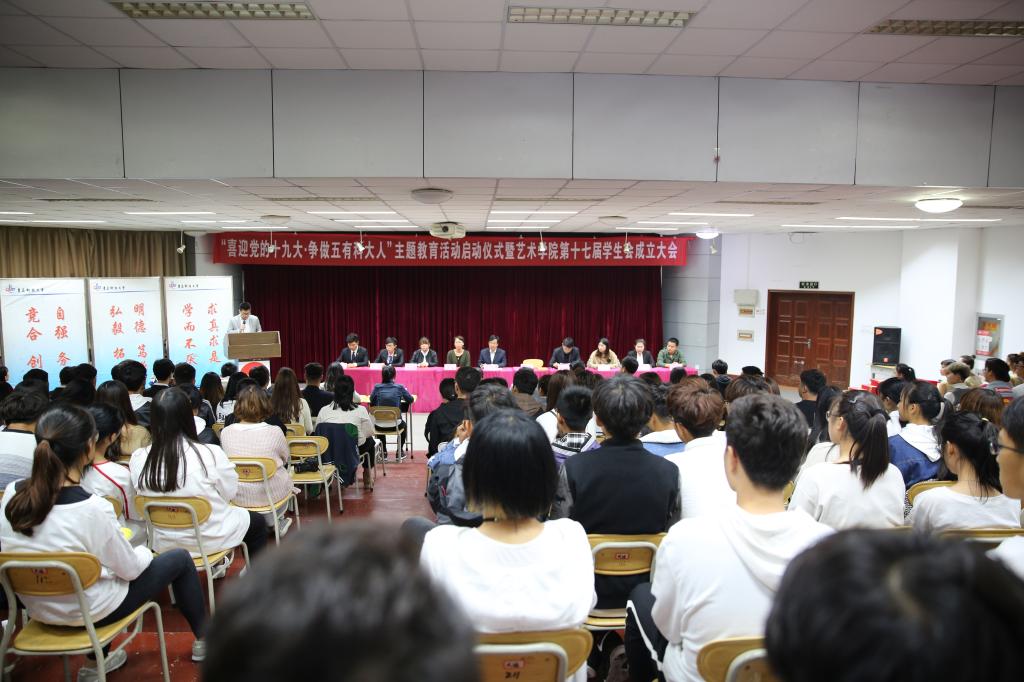 为迎接党的十九大胜利召开,助力“五有”高水平大学和“双一流”建设,艺术学院在全院学生中开展了“喜迎党的十九大、争做五有科大人”主题教育活动。10月10 下午,活动启动仪式在崂山校区大学生活动中心和美术馆举行。