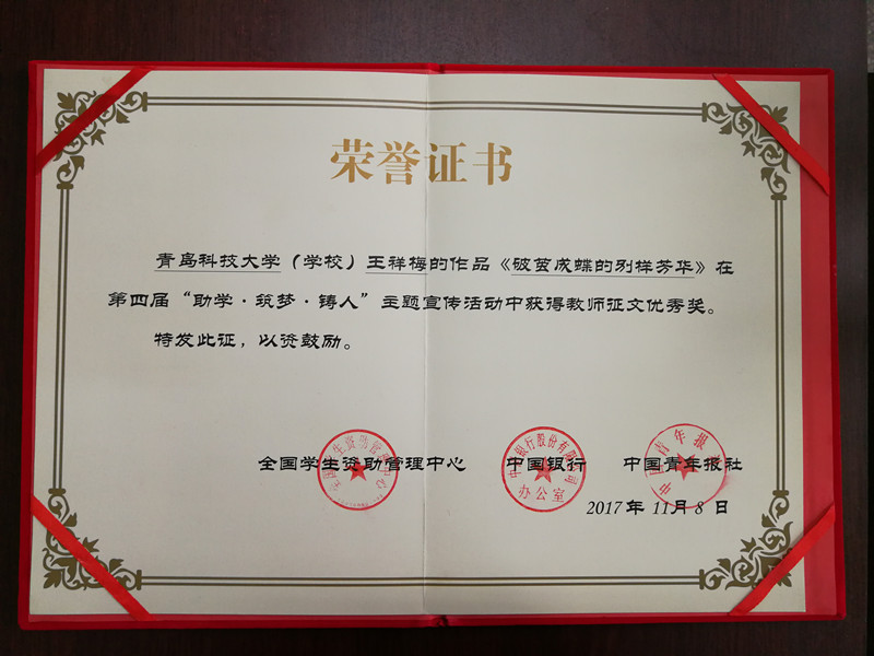 近日,由全国学生资助管理中心、中国银行、中国青年报社主办的第四届“助学·筑梦·铸人”主题宣传活动获奖名单公布,天游官网王祥梅老师荣获教师征文优秀奖(全国共50名),这是天游官网在此项活动中的首次获奖。