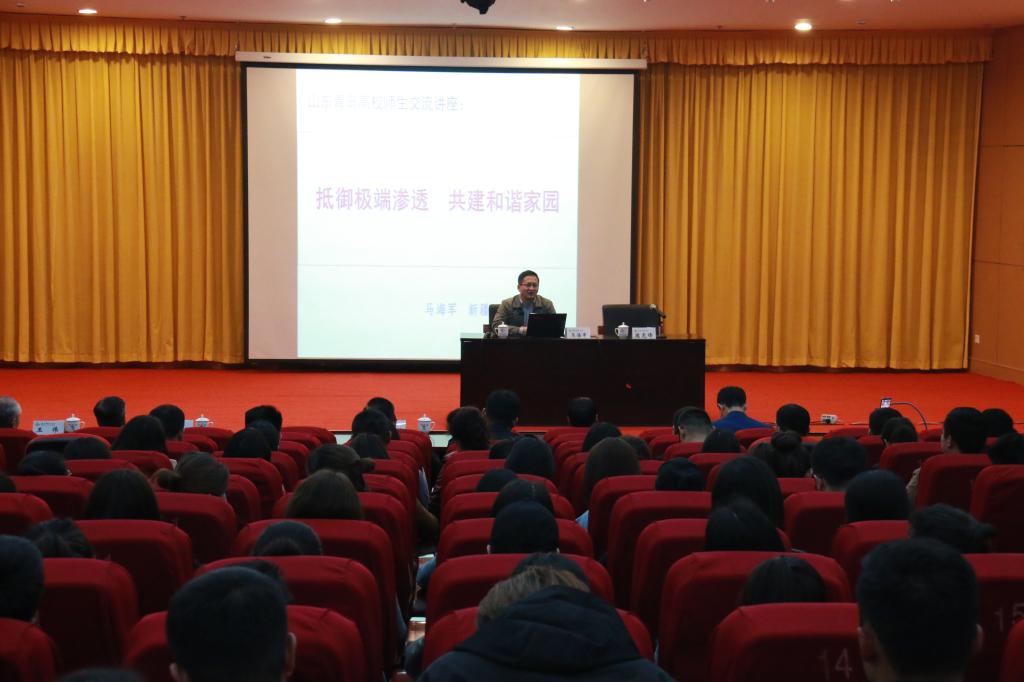 马海军教授从为什么要加强反分裂、反渗透工作和怎样依法治理“三股势力”的暴恐、分裂、渗透活动两个方面,全面介绍了我国当前反恐维稳所面临的国内外严峻形势,详细分析了暴恐势力给国家和普通民众带来的严重危害,并结合《反恐法》、《去极端化条例》等法律、法规解读了当前维护国家安全、实现新疆社会稳定和长治久安总目标的重要性。他还号召广大少数民族师生要加强学习、明辨是非、坚定政治立场,正确认识和处理相关问题,自觉抵御极端思想渗透,为维护民族团结、社会稳定和国家安全做出积极贡献。