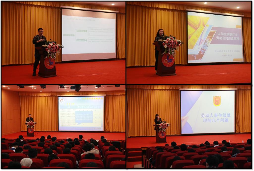 讲座中,王赟围绕青岛市高校毕业生就业、创业政策方面,讲解了高校毕业生在就业和创业中面临的问题以及政府补贴政策;刘瑞玲介绍了劳动合同的内容和作用、如何正确与用人单位签订劳动合同及用人单位不与劳动者签订劳动合同的后果,同时向同学们讲述了如何利用工资有关规定维护自身的合法权益;李崇政对社会保险征缴进行了知识普及、政策宣传、介绍了社会保险的险种以及缴社保的好处;王青用真实案例向同学们详细说明了如何进行自身就业权益维护和保障,并为同学们讲解了大学生就业应当知道的几个法律问题。讲座结束后,几位老师现场回答了同学们的提问。