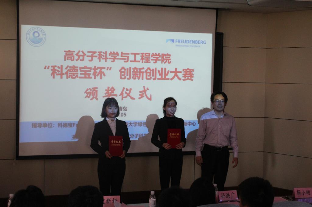 经过前期专家初评,最终有10项作品进入决赛答辩环节。决赛评委由企业资深人士、校内学生工作处、团委以及高分子学院专业教师组成。决赛环节,各参赛团队以PPT展示的形式进行汇报,评委现场提问、点评。最终评出一等奖1项、二等奖2项、三等奖3项以及优秀奖4项。获奖团队将得到科德宝集团的奖金支持,同时学院将继续培育孵化,积极推荐优秀团队参加省市、国家的各类创新创业比赛。