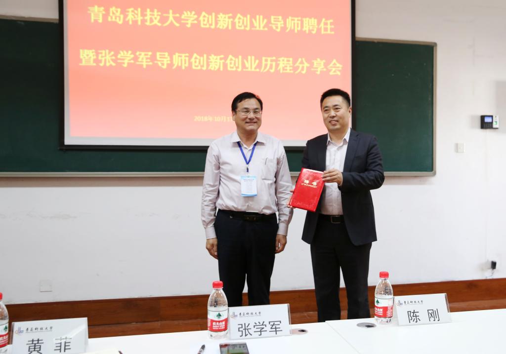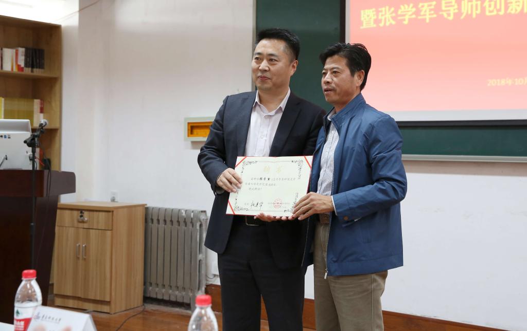 陈刚代表学校为张学军颁发“天游ty8检测中心大学生创新创业教育导师”聘书;王士卿为张学军颁发“天游ty8检测中心传播学院客座教授”聘书。