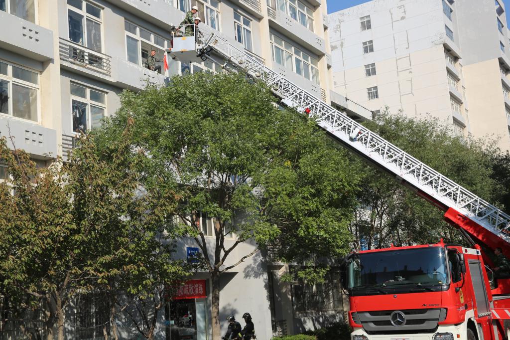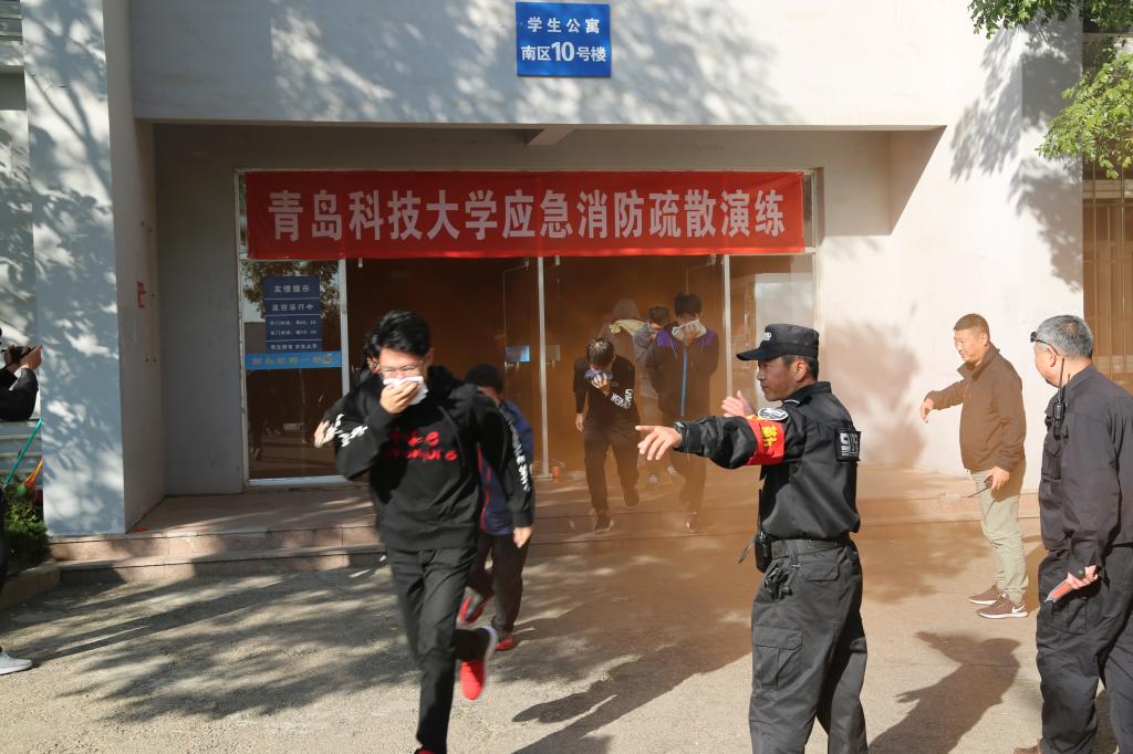 保卫处副处长严增兴下达指令后,演练正式开始,宿舍楼内浓烟滚滚,消防警报立即拉响,负责各楼层疏散引导的辅导员、消防志愿者迅速到位,参演学生身着简装、手捂湿毛巾在现场人员的指挥下快速、有序地集合到楼前空旷地带。在接警后,消防战士利用消防水车对楼上“着火点”进行喷水灭火,用消防登高梯将位于5层的被困学生救下,医疗组立即对学生进行全面检查。整个活动按照预定的方案紧张有序地进行,没有出现拥挤、争先恐后等现象,表现出了较好的应急逃生素质,圆满地完成了消防演练任务。最后,崂山消防大队专业消防员对本次活动进行总结讲评,并介绍演示了灭火器使用方法和注意事项。