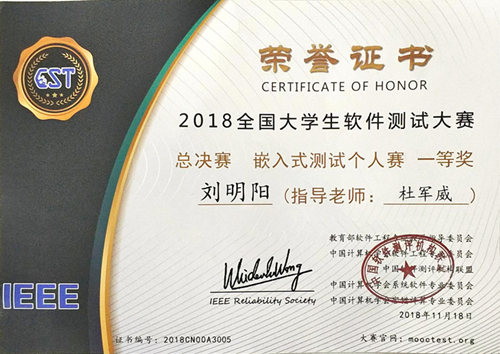 11月18日,2018全国大学生软件测试大赛颁奖典礼在南京大学礼堂举行,天游ty8检测中心信息学院参赛选手在本项赛事中获得佳绩。计算机161班刘明阳荣获“旋极杯嵌入式测试”全国总决赛个人赛一等奖;计算机161班李奇伟荣获全国总决赛个人赛二等奖;软件151班安仲辉荣获“上海软件中心杯开发者测试”全国总决赛个人赛二等奖;宋金明等同学荣获这两项赛项个人赛三等奖8项;学校荣获大赛“最佳组织奖”;信息学院杜军威老师荣获 “优秀指导教师”。