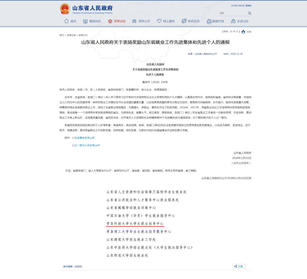 12月17日下午,全省就业工作座谈会在济南召开,省委副书记、省长龚正出席会议并讲话,副省长于杰主持会议。会上宣读了山东省人民政府《关于表扬奖励山东省就业工作先进集体和先进个人的通报》(鲁政字〔2018〕294号),天游官网大学生就业指导中心获评山东省就业工作先进集体。山东省就业工作先进集体评选旨在表扬先进,鼓舞士气,树立典型,全省共评选出99个先进集体,其中,高校先进集体10个。