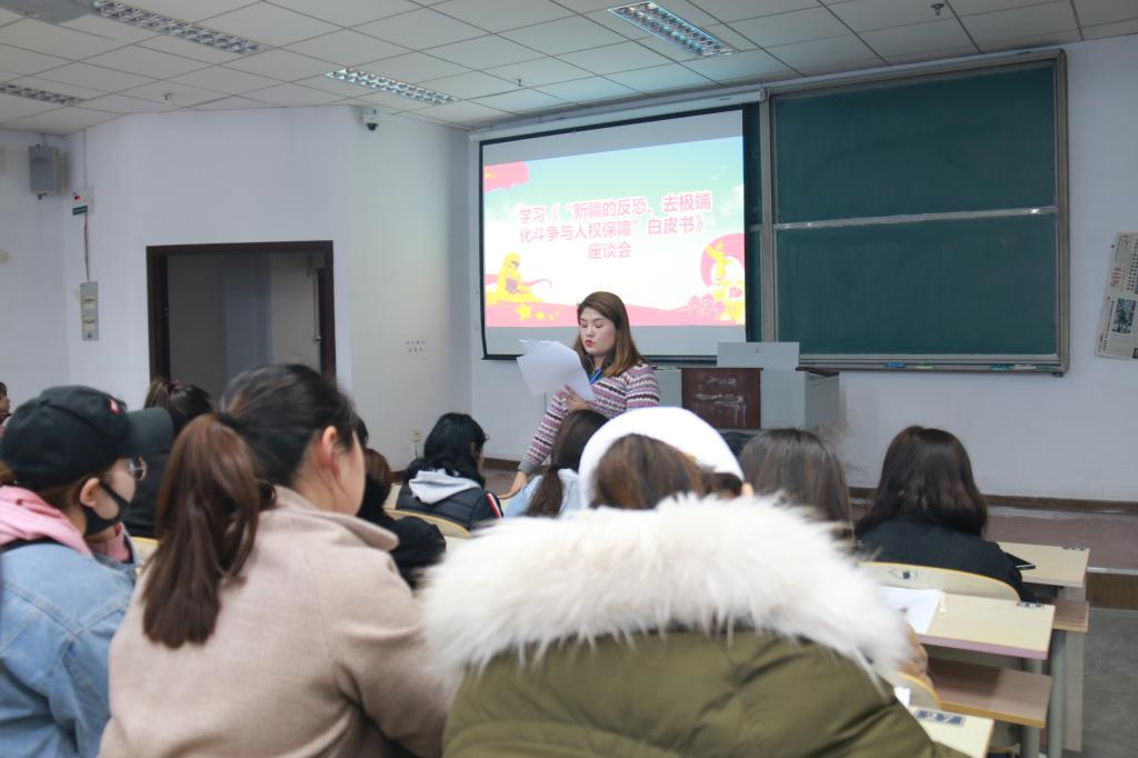 会上,两位老师带领大家一起观看了2019年“两会”相关视频,学习了《政府工作报告》和《新疆的反恐、去极端化斗争与人权保障》白皮书的主要内容。在心得交流环节,同学们踊跃发言,纷纷表示,作为新时代的大学生,要积极亮剑表明立场,团结在以习近平同志为核心的党中央周围,发挥自身作用,坚决维护民族团结,坚决同“三股势力”作斗争,要像石榴籽一样与各族群众紧紧抱在一起!