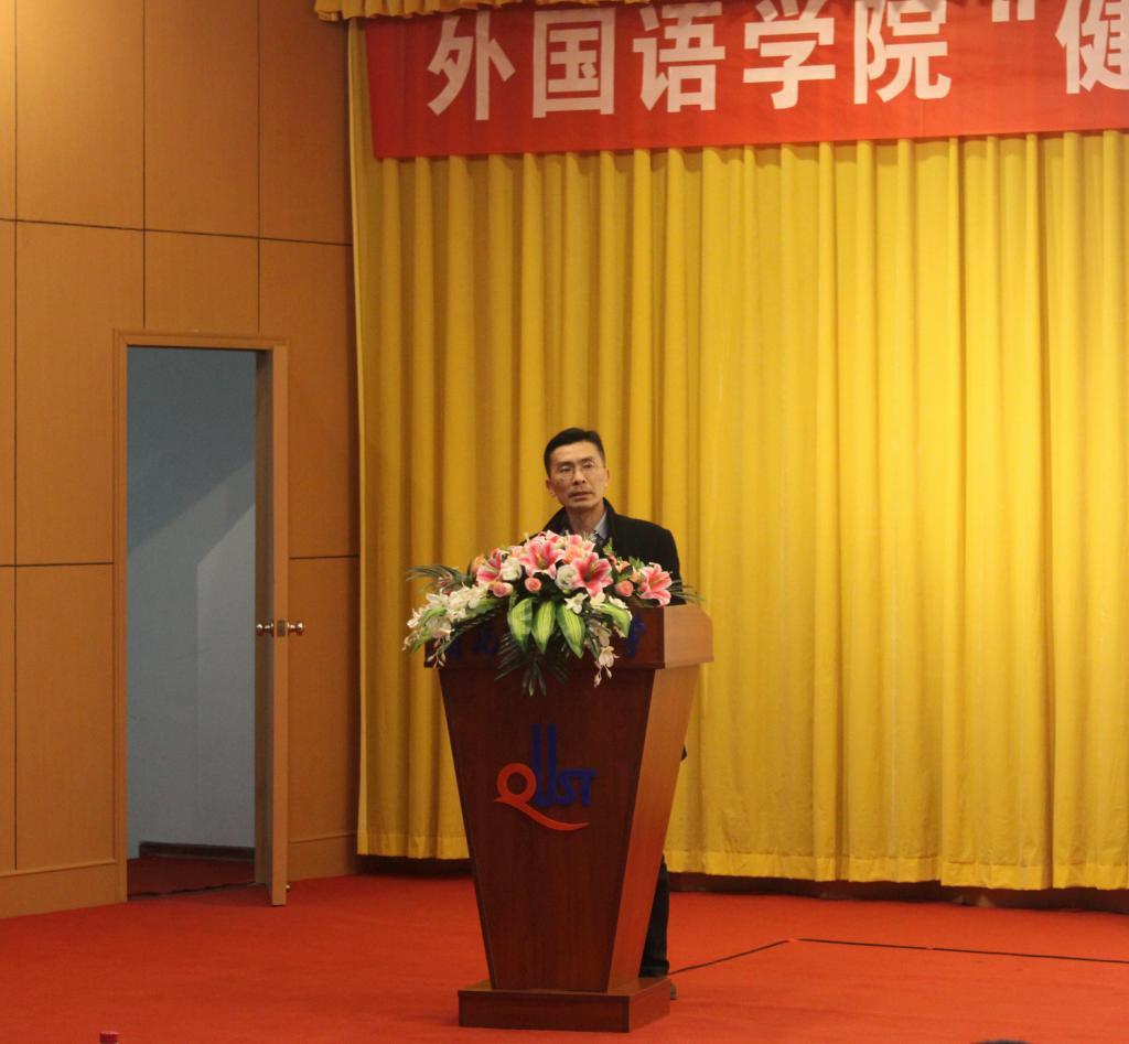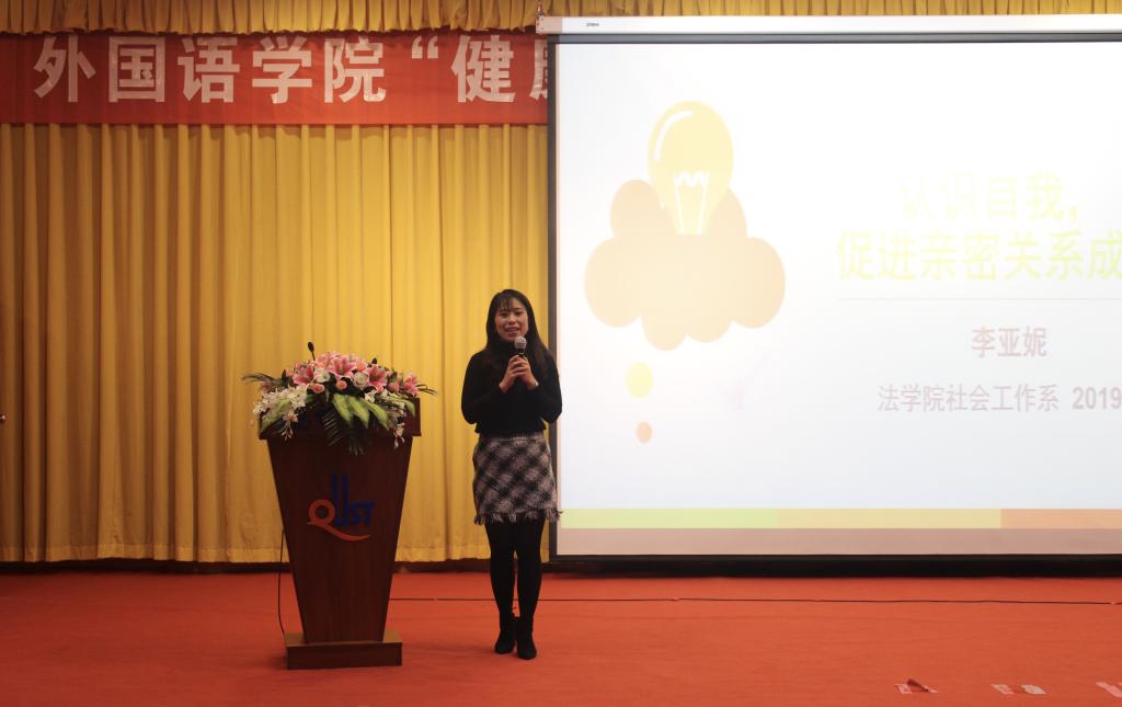 宋飞宣读了《关于开展外国语学院“健康心态,美丽人生”心理健康月的通知》,强调了心理健康教育对于营造大学生良好成长氛围的重要性,希望同学们能够树立起关爱自我的意识和良好的个性心理品质,营造人人关心心理健康的良好氛围。