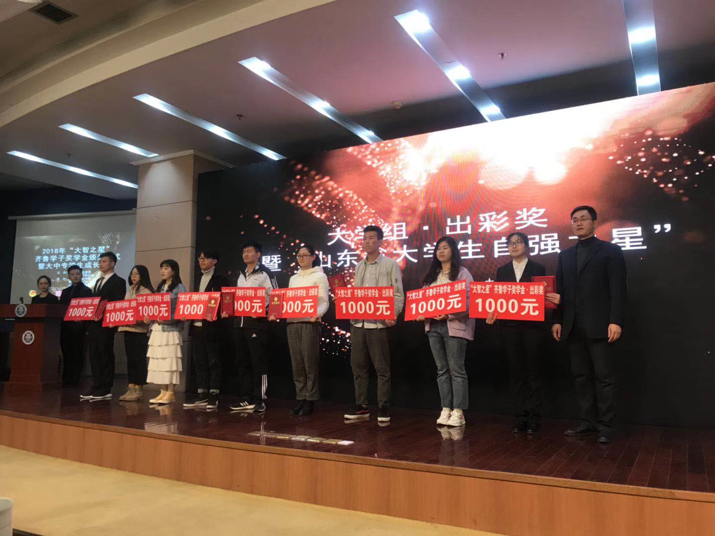 2018年5月,团省委、省学联等单位启动了2018年“大智之星”齐鲁学子奖学金评选活动,旨在深入学习贯彻落实习近平新时代中国特色社会主义思想和党的十九大精神,选树和宣传一批可亲、可敬、可信、可学的优秀青年学生典型,发挥示范引领作用,引导广大青年学生坚定理想信念、练就过硬本领、勇于创新创造、矢志艰苦奋斗、锤炼高尚品格。经校内宣传发动、学生自主报名、各院系推荐、学校评选,省级专家委员会审定,最终产生“山东省大学生自强之星标兵”(授“榜样奖”)10名、“山东省大学生自强之星”(授“出彩奖”)40名和“山东省大学生自强之星提名奖”25名。