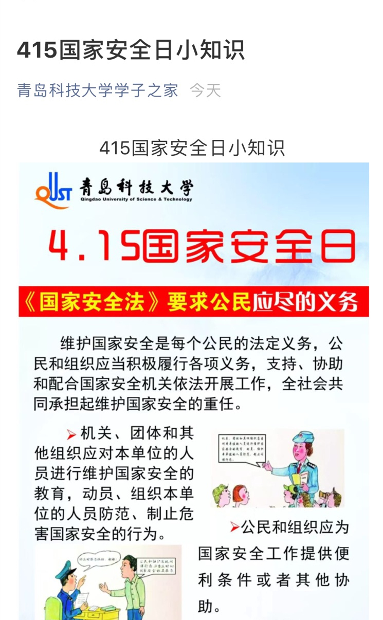 活动中,学生处线上通过“学子之家”微信公众号推送了“4·15国家安全日”宣传网文,线下分别在崂山、四方两校区宣传栏张贴了宣传海报,在崂山校区图书馆1楼大厅、四方校区行政楼1楼大厅摆放了宣传展板,对《国家安全法》规定的公民应尽义务、国家安全保密十不准、警惕危害国家安全的活动、如何鉴别危害国家安全的活动、如何应对间谍行为、大学生如何增强反间谍意识等进行了广泛宣传。