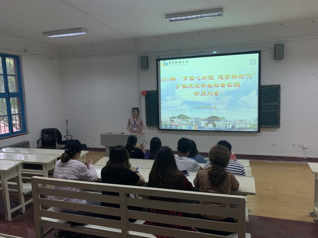 7月14日晚,学生处在四方校区一号行政楼243教室,组织召开2019年“青春心向党·建功新时代”少数民族学生社会实践动员会。10余名新疆籍少数民族学生参加活动,活动由少数民族学生辅导员巴合提努尔主持。