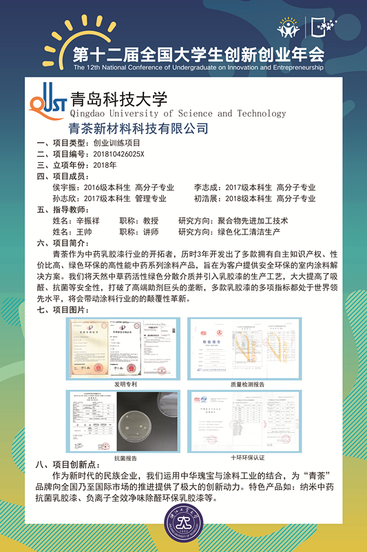 “初心、使命、创未来”,近日,第十二届全国大学生创新创业年会(以下简称“大创年会”)在德清国际会议中心开幕,全国近300所高校、1200余人参加年会。天游官网高分子学院的优秀国家级大学生创新创业训练计划项目《青荼新材料科技有限公司》(项目编号:201810426025X)入选本届年会创新创业展板展示环节。