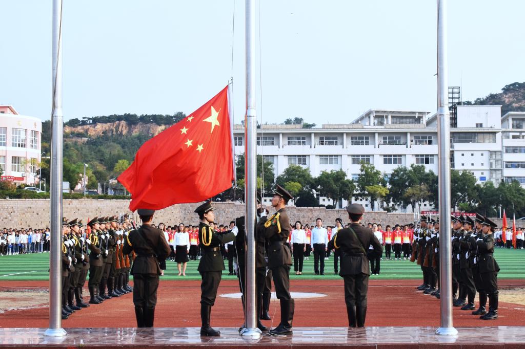 为庆祝新中国成立70周年,国庆勿忘祭英烈,学校在四个校区举行“我与祖国共奋进”升国旗特别活动,全校万余名师生参加活动,缅怀先烈,致敬祖国,升旗仪式中同升一面旗,同唱一首歌”。现场青年学子用队形变换出“1949”和“2019”的字样,用流动的艺术表达对于中华人民共和国成立70周年的衷心祝愿。