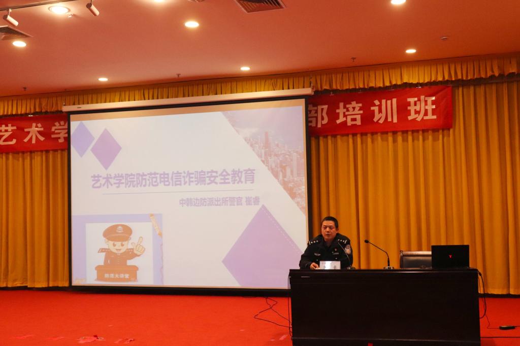 11月26日下午,艺术学院在学校第三报告厅召开2019年团学干部培训班,特邀中韩边防派出所警官为艺院学子讲授《防传销防诈骗在大学校园的重要性》安全讲座,作为唯一一门横跨大学四年的必修课程,从签订安全告知书、召开入学教育安全专题班会,宿舍安全教育等系列安排,筑牢学生防诈骗安全意识,为学生成长保驾护航。依托学院团学干部培训班,进一步加强学生骨干队伍建设,提高团学干部的政治素质、工作水平和实践能力,有目的、有效果地引导团学干部在自我教育、自我管理、自我服务、自我监督中发挥模范带头作用。