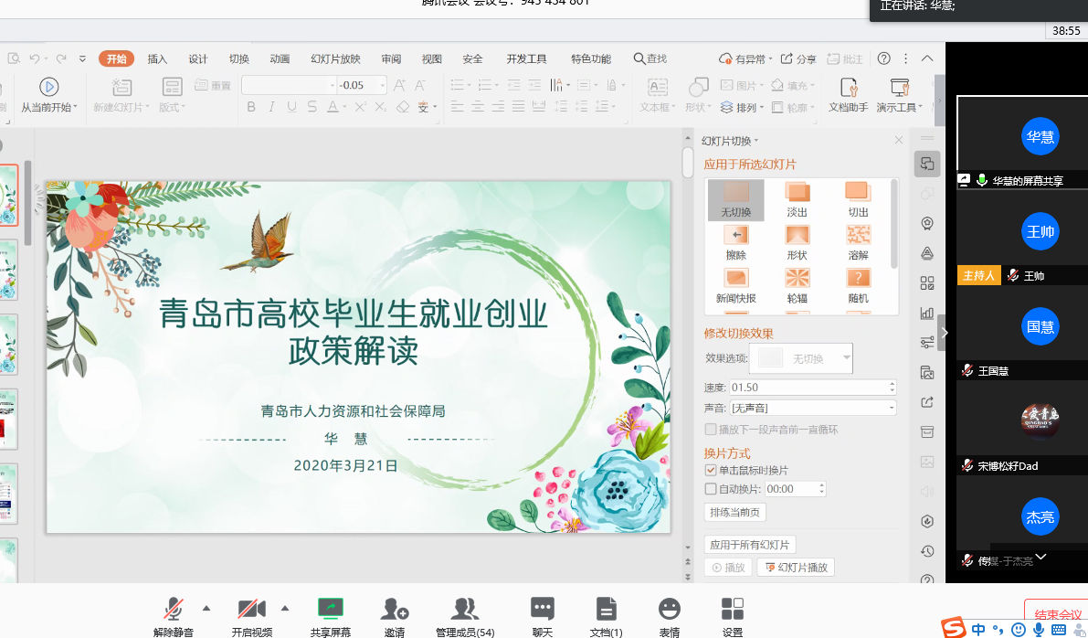 会上,华慧围绕高校毕业生网络招聘平台、“青岛人社·学历汇”、高校毕业生落后及住房保障、高校毕业生就业、创业政策等五个方面,介绍了当前毕业生参加网络招聘会实效和学历汇认证情况,对高校毕业生落户的条件和程序、档案托管服务、一次性安家费、小微企业就业补贴、创业担保贷款和税费减免等利好政策的落地实施,进一步详细解读。并与毕业生辅导员线上互动交流,对大学生关心的问题作出解答和回应。