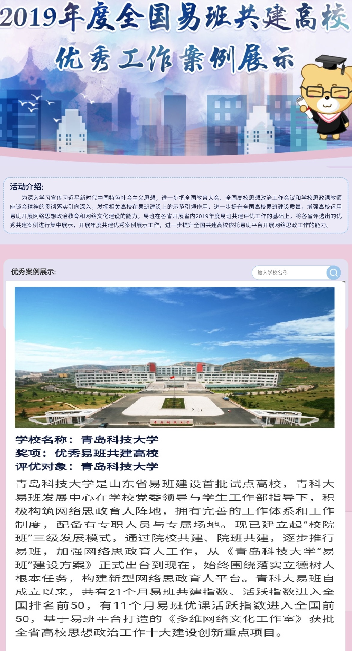 2017年6月学校成为山东省易班建设首批试点高校以来,始终围绕立德树人根本任务,构建新型网络思政育人平台,现已建立起“校院班”三级发展模式,易班注册用户已达41642人,机构群26个。截至目前,共有22个月易班共建指数、活跃指数进入全国排名前50,共有11个月易班优课活跃指数进入全国前50,2020年3月易班共建活跃指数排名全国第9。基于易班平台打造的《多维网络文化工作室》还获评山东省高校思想政治工作十大建设计划创新重点项目。