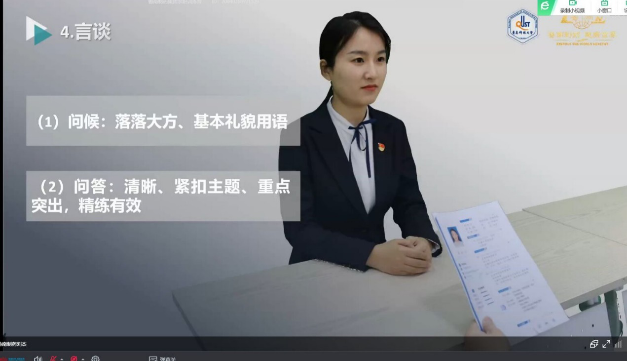 良好的礼仪可以使求职过程焕发光彩,为帮助学生熟知求职过程,提高求职技能,解决求职过程中的礼仪问题,化工学院联合鲁南制药集团,举办“云求职 云招聘”校企联合训练营第二期,鲁南制药集团山东新时代西南大区招聘总监韩炜炜做客分享会,化工学院党委副书记孙明媚,辅导员耿赛、付文静及360余名学生参加。