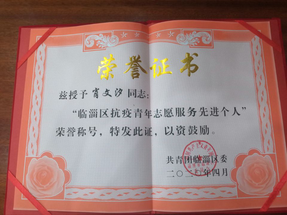 “疫情就是命令,防控就是责任”。面对来势汹汹的新型冠状病毒感染的肺炎疫情,作为一名优秀共青团员,高分子科学与工程学院塑料192班的肖文汐同学挺身而出,主动请缨加入临淄籍返乡大学生防疫专项青年突击队。志愿期间,其事迹先后被青春淄博、青春临淄、临淄警界和临淄云等多家媒体、公众号宣传报道,并于2020年4月被共青团临淄区委授予“临淄区抗疫青年志愿服务先进个人”荣誉称号。