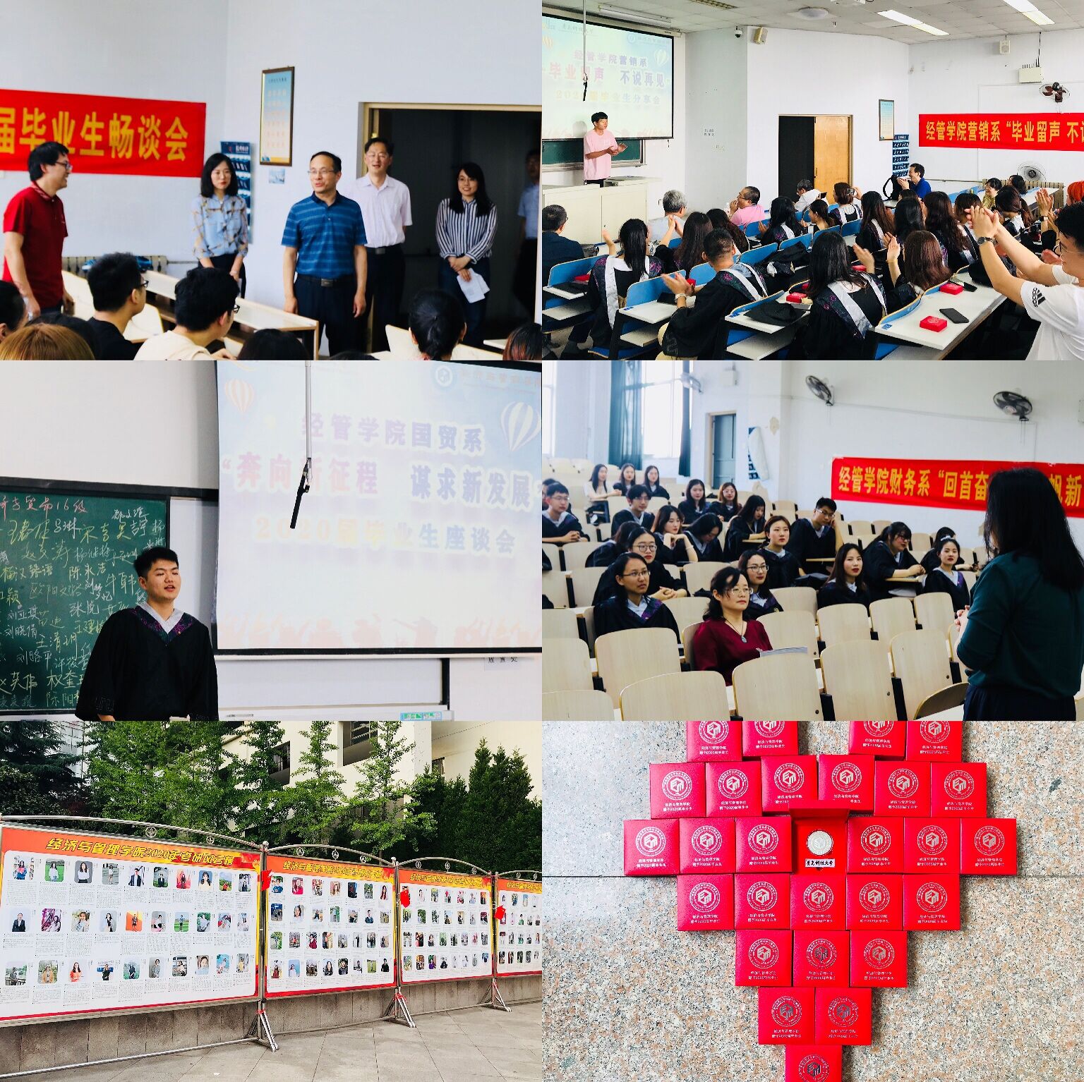 惜别.远航——恋母校,一枝一叶总关情。6月14日,学院在弘毅楼7个教室举行七专业各具特色的毕业生主题活动,国贸的座谈会、管理的最后一堂课、财务的欢送会、工业的惜别会、城管的交流会、营销的分享会、物流的畅谈会,各系主任、专业老师、辅导员老师为即将离开母校的学子送上毕业寄语。在这个特殊的毕业季,学院为同学们准备了暖心小礼物:一枚校徽和一枚院徽,希望同学们带着学校的祝福、带着在经管学习生活的美好回忆,开启人生新征程。会后,全体同学共同收看了校毕业典礼暨学位授予仪式直播。