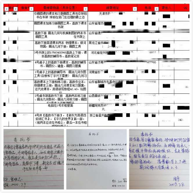 此次活动由辅导员带头,并在辅导员具体指导下完成,前期经过细致统计、筛选,确定需要邮寄物品的学生名单、所在宿舍号、需邮寄物品以及邮寄地址等,每名学生写委托书拍照交给辅导员,辅导员核对需要邮寄的物品后,带领学生干部、入党积极分子以及热心同学到学生宿舍与学生通过视频连线、电话等方式再次确定需要邮寄的物品,实行“点对点”责任制,每名师生负责1-2名同学的物品,对物品进行细致包装、保值和加急,确保物品能够以最快的速度完好无损地寄送到学生手中。