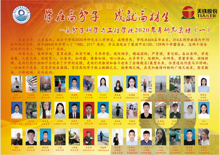 随着2020年考研、考博录取结果的陆续出炉,高分子学院捷报频传,624名本科毕业生中312名同学成功升学,升学率首次达到50%,其中78%的同学考入了浙江大学、四川大学、北京化工大学等985、211高校,20人升入英国谢菲尔德大学、新加坡南洋理工大学和日本大阪大学等全球知名高校继续深造。涌现出了慧园甲北120、129两个“学霸宿舍”(宿舍6名同学均被“985、211”高校录取)。另外,有17名硕士毕业生成功考入中科院、复旦、上海交大等名牌大学的博士研究生,“学在高分子,成就高材生”深深地印入同学们的心里。