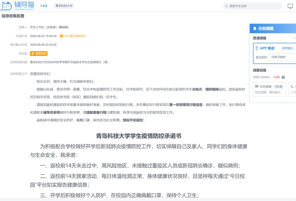 “周密化”做好学生开学准备。学校学生工作专班提前部署学生开学相关工作,持续开展学生安全教育,明确返校条件,细化返校流程,利用信息化手段开展入校核验,提高学生入校效率。返校前14天,组织学生开始通过“今日校园”平台每天报送健康信息;返校前3天,发布返校信息收集任务,将《学生疫情防控承诺书》嵌入其中,组织学生“先承诺后返校”,精准统计学生返校行程信息,精细开展“应检尽检”学生摸排,建立重点人群台账。