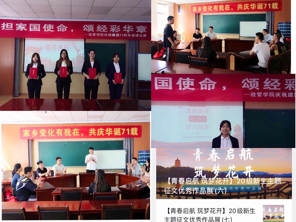 学院组织开展“家乡变化有我在,共庆华诞71载”主题座谈会,来自新疆、贵州、海南的同学们忆家乡、谈变化、话发展、赞祖国,在实现全面建成小康社会的目标之际,以切身感受赞叹祖国伟大发展。同时,学院组织“我身边的祖国建设者们”主题分享活动,“青春起航、筑梦花开”主题征文等活动,鼓励全院学生在严肃肃穆的仪式中接受“沉浸式”精神洗礼,树立积极的人生价值观。除此之外,经管学院以学生为主体,在线上平台开展“四史学习”知识竞赛、线下开展“担家国使命、颂‘经’彩华章”演讲比赛,在实践中“固初心、悟原理、启智慧”,全面提升学生素养,形成热爱伟大祖国、礼赞美好时代的热烈氛围。
