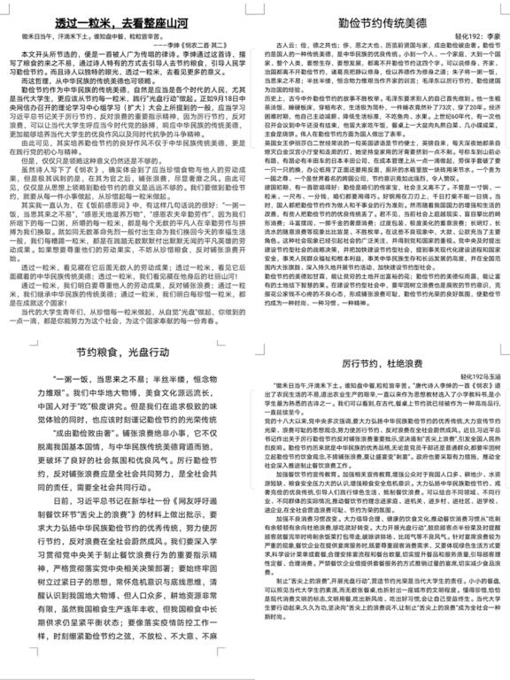 加大宣传力度,将“勤俭节约,珍惜粮食”的思想深入落实,学院组织开展“节约粮食”主题征文,力求以文字的方式,深化同学们对勤俭节约,杜绝浪费的认识。