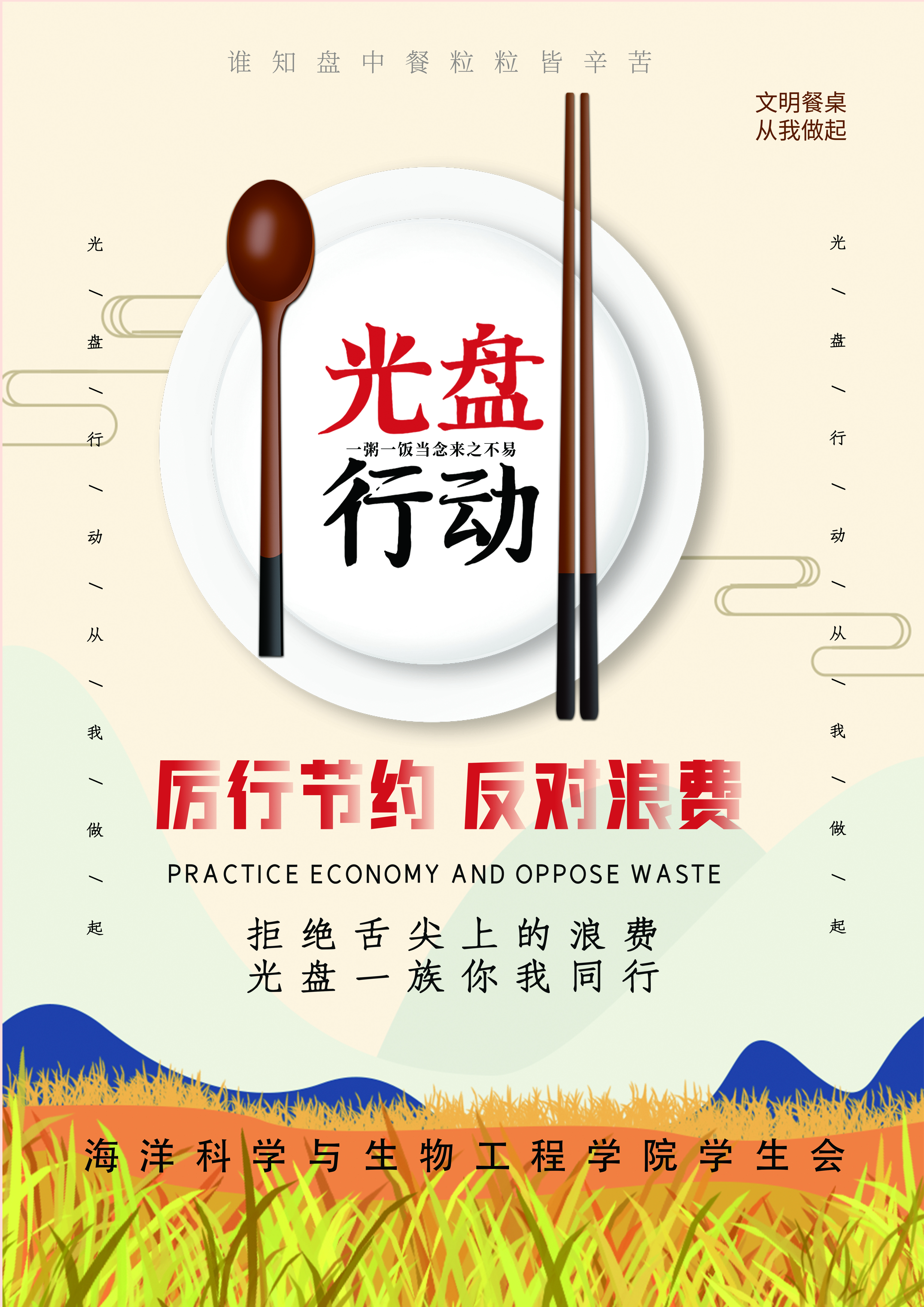 节约粮食,杜绝浪费的良好风尚不仅需要人人自觉,还需要大家互相促进,相互监督。为号召大家珍惜粮食,吃尽盘中餐,真正感悟到“谁知盘中餐,粒粒皆辛苦”,海洋学院针对各年级学生举办“光盘打卡”活动,号召同学们在QQ空间和微信朋友圈等公众平台“晒”出自己的“光盘”,引导学生吃光盘中餐,以饭后“光”为荣,用实际行动来践行勤俭节约的优良传统。