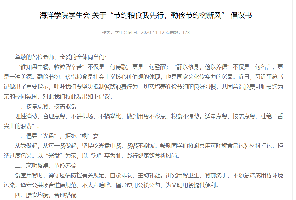 勤俭节约是中国优良的传统美德,为深入贯彻习近平总书记关于坚决制止餐饮浪费行为的重要指示精神,培养学生养成勤俭节约的好习惯,在全院营造浪费可耻、节约为荣的良好氛围,引领带动校园文明新风尚,海洋学院积极作为,主动部署,扎实有效开展“制止餐饮浪费 培养节约习惯”专题教育活动。