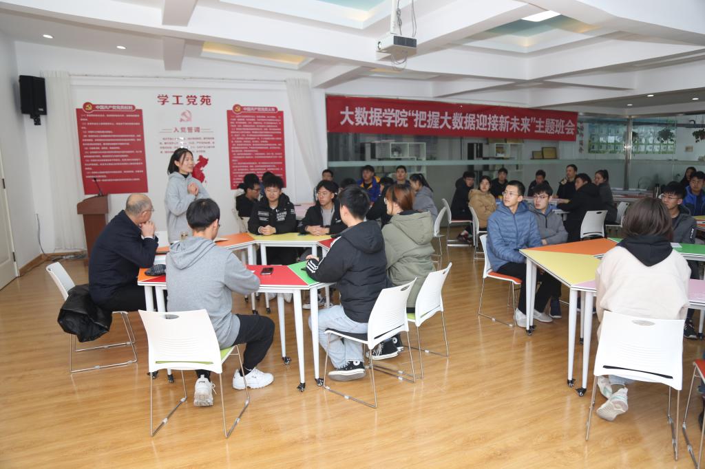李硕、范雨萌、孙雪璐、曹凯旋等学生代表先后发言。李硕对本学期的班级工作进行了回顾总结并介绍了近期班级建设情况。大数据201班团支部书记范雨萌介绍了团支部丰富多彩的团支活动(会)、团支部建设情况以及团员积极申请入党的情况。她表示,将联动团支部与班级科创小组,打造具有大数据专业特色的“团聚力”卓越团支部。大数据202班团支书孙雪璐谈了对大数据专业的认识,她说,我们不能单纯的把大数据看成简单的数据集,而应该将数据编织成“网”,与我们的学习和生活相联系,培养对大数据的热爱,兴趣驱动学习。大数据202班班长曹凯旋介绍了大数据202班的班级情况,他以军被大赛和跳大绳比赛为例,展现了大数据两个班团结协作的优秀风采。他说大数据201班与202班是兄弟班级,应该共同努力,齐进步,共发展。