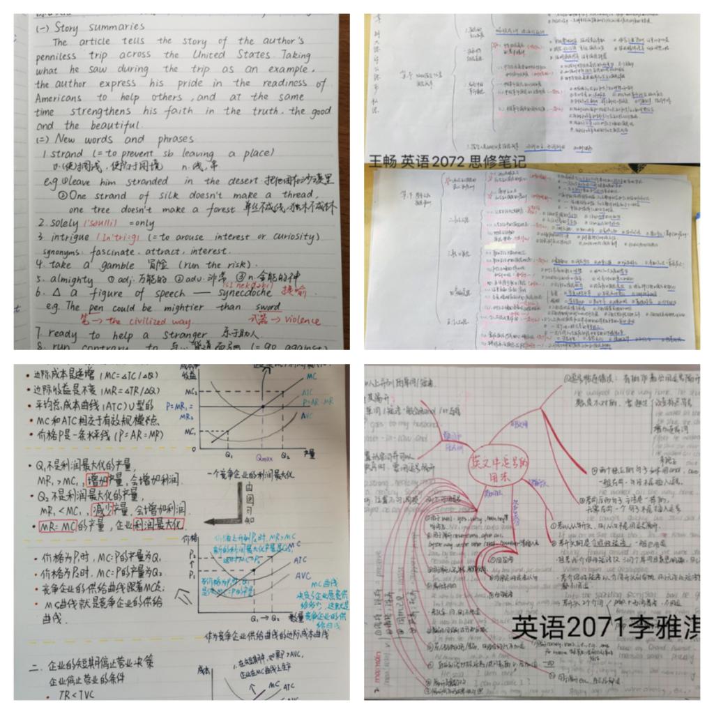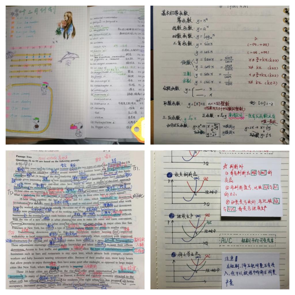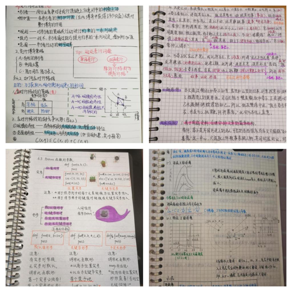 高数较难,常有学生挂科,学生日常用时较多,成为了笔记的热门内容。“在课堂上认真听课,将自己感觉重点的地方记在书上,下课及时巩固,先看一遍课本,疏通整体脉络,然后认真的打开老师的PPT,根据PPT内容和自己的思考进行补充,能用图形表示的地方要用图形画出,将自己感觉重要的地方用蓝色笔,特别重要的用红色笔,一些不太用的知识点用绿色笔,基础知识用黑色笔,要规则的,美观的呈现。”同学如是说。