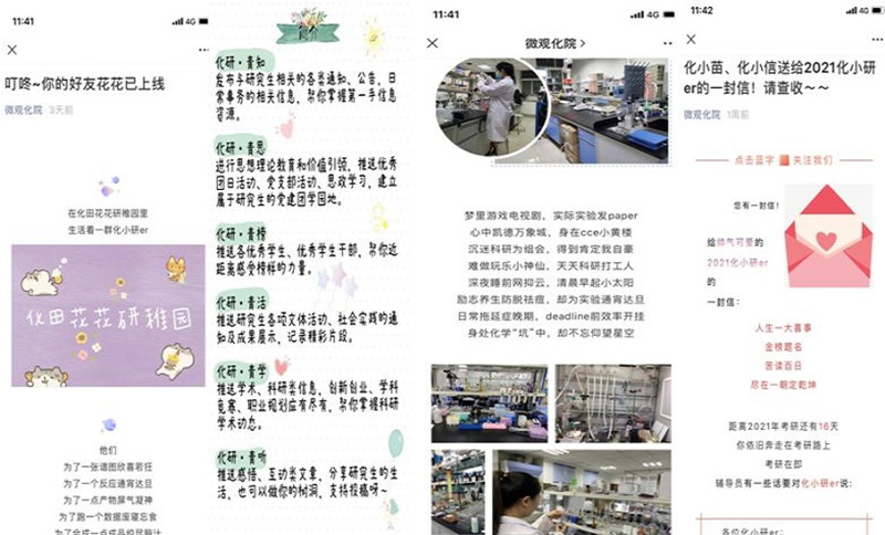 深挖网络思政,促进协同发展。近日,学院官微“微观化院”新增“化小研”栏目,通过线上的网络思政促进本科生与研究生的交流。以“化研•青知”“化研•青思”“化研•青榜”“化研•青活”“化研•青学”“化研•青听”六个板块为载体,全面打通“研本化合工程”线上线下的思政育人平台,深度融入学科建设大局,形成学生自我教育、自我管理、自我服务的体制机制。化学院将持续推进“德育铸魂、智育固本、体育强基、美育化人、劳动淬炼”为主题的“研本化合工程”,做到“三全育人、五育并举”。
