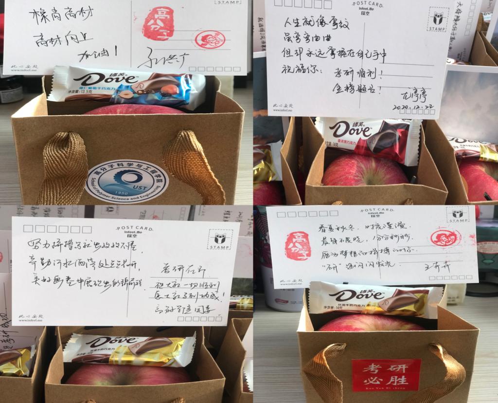 高分子学院将升学作为高质量就业的重要途径之一,并纳入学院“一把手”工程,重点推进。学院学工办多措并举,通过在宿舍楼设置考研自习室、制作专属加油视频《加油!考研人》等方式,在寒冷的冬日里,给予考研学子暖心鼓励与支持,为考研学生保驾护航。本次“考研加油包”包含一张由学院领导、班主任、辅导员亲手书写的明信片、一个苹果和一块德芙巧克力,寓意“考研得福,平安上岸”。收到满满的祝福,同学们纷纷表示,一定不会辜负学院领导和老师的期望,将带着嘱托与希冀,信心与坚持,竭尽全力备考,沉着冷静应战,充分展现实力,正确看待结果。