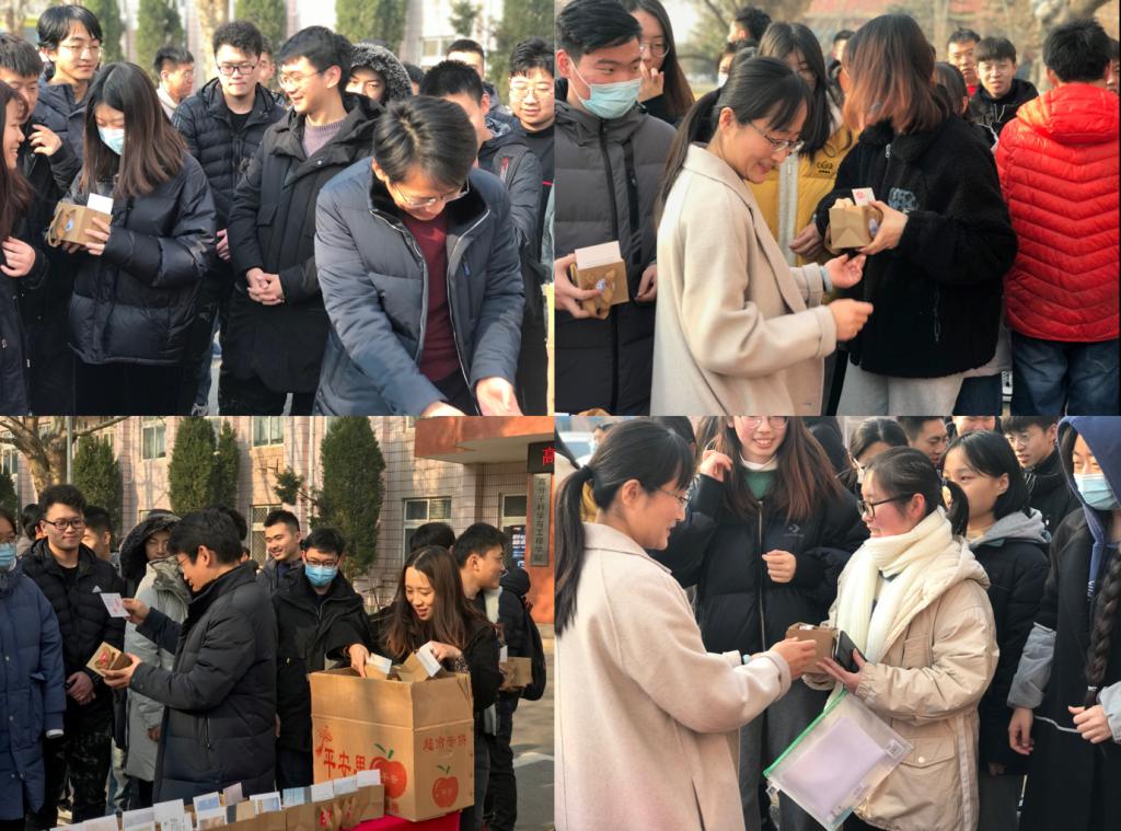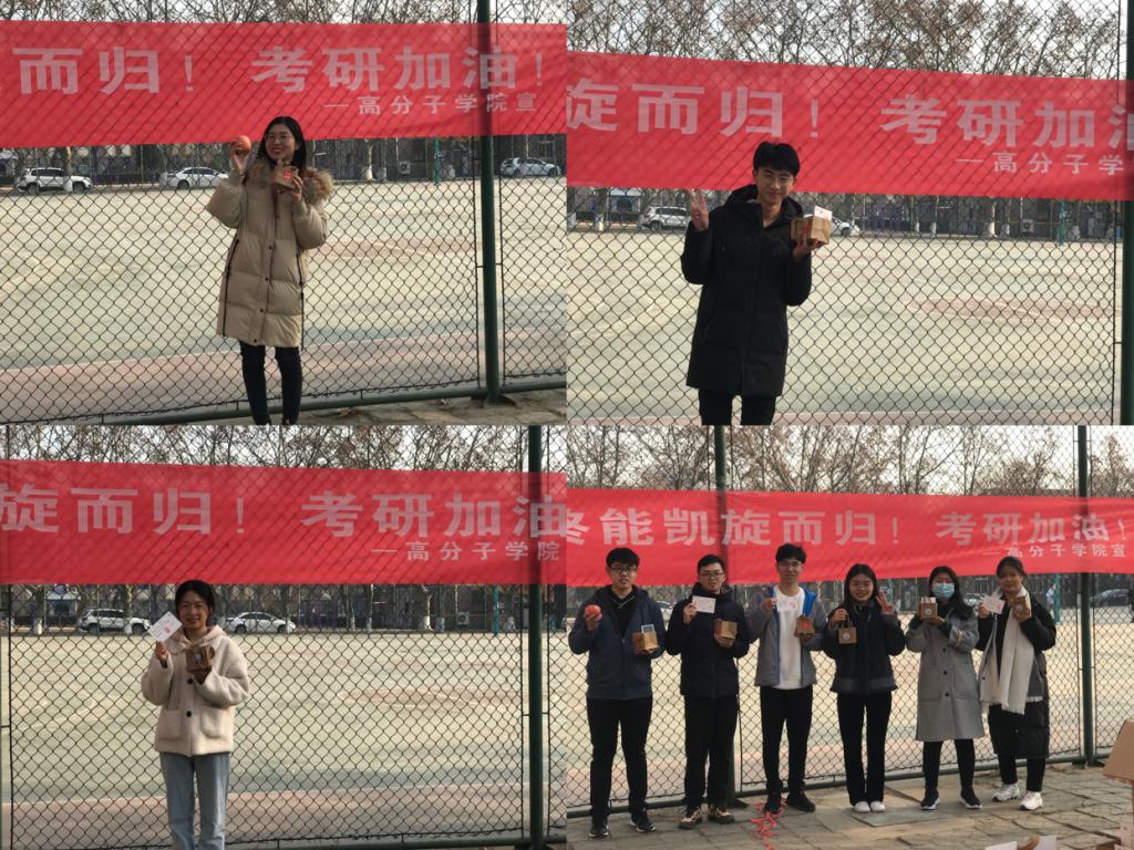 2020年12月26日,2021届毕业生即将迎来研究生入学考试。为了给学院520余名考研学子加油鼓劲,为他们坚定应考意志,树立必胜信心,12月22日,高分子学院开展了“研路有爱,考研加油”暖心助力活动。学院党委书记孙洪广、党委副书记尤亭亭及学工办老师为到场的全体考研学子发放了精心准备的“考研加油包”,并送上暖心祝福。