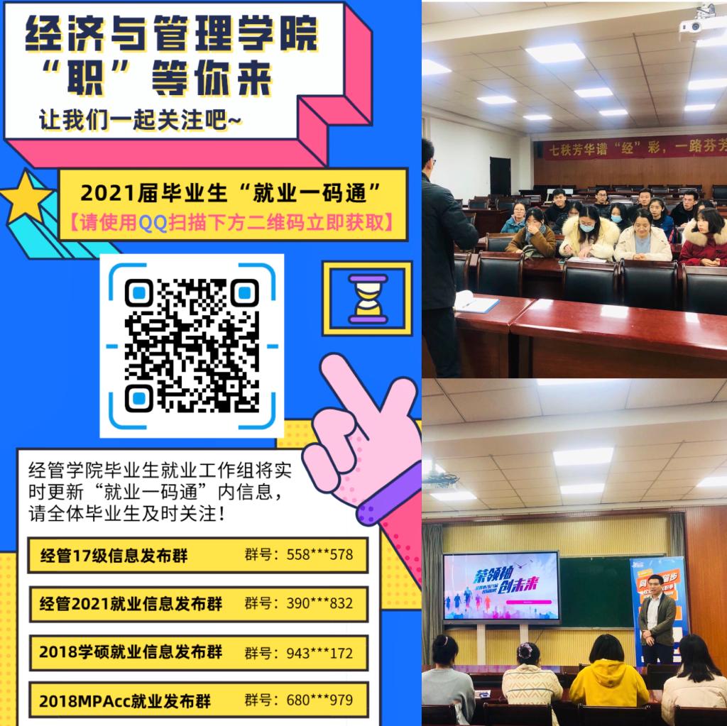 前期,经管学院高标准、严要求,扎实推进毕业生就业工作:学院学工办定期召开就业指导会,对接学校就业部署,规划近期就业工作,分析往届毕业生就业分布,并做好已签约学生跟进;成立就业推进工作组,深化实化就业状况排摸和毕业生就业意向调查工作,建立就业精准摸排“台账”,完善长效精准帮扶机制;开展专业动员大会,介绍疫情防控常态化下的就业、考研形势和政策,分析未来趋势和变化;组织考研经验分享会,邀请往届取得优异考研成绩的学长学姐分享学习经验,交流心得体会,为考研的同学们在最后一个月的冲刺关头排忧解难,加油助力;强化网络育人成效,通过经管学院微信公众号、官方QQ平台及 经管学院信息发布群等,开辟就业模块,定期推出就业相关服务,推送就业相关技巧,助力同学们扬帆起航。