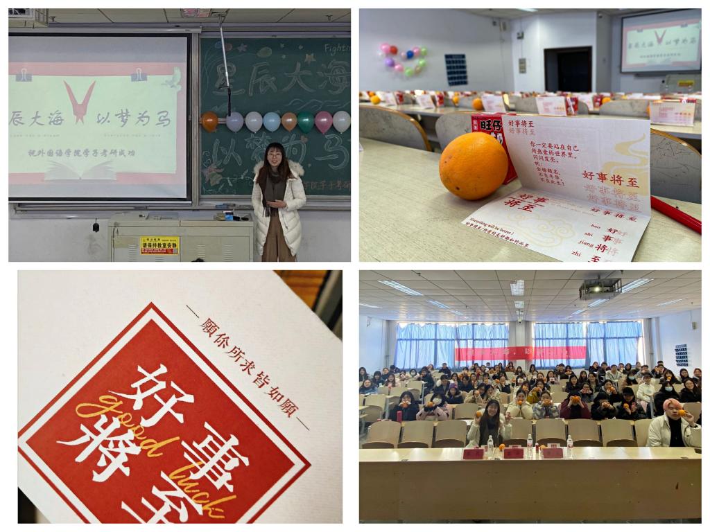 外国语学院高度重视毕业生的考研工作,举办了系列考研经验交流会、为考研学子送温暖等活动,全方位、多举措关心关爱考研学子,鼓励大家积极备考,努力实现理想目标,实实在在的为考研学生提供必要的指导和帮助。