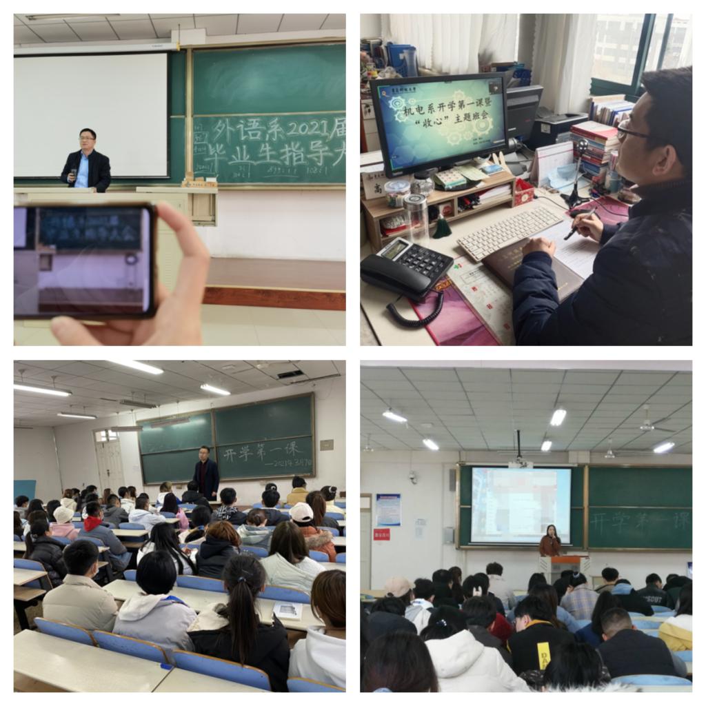 外语系邀请系主任、专业课教师围绕疫情防控、安全教育、爱国主义教育、挑战杯备赛、就业等开展系列教育活动。经管系通过戍边英雄事迹等,与同学们共话爱国主义并对毕业生进行了相关指导。高材系根据不同年级开展相应的教育并深入课堂听课。艺术系从疫情防控、宿舍建设、学风建设、专升本和就业情况等方面开展教育。计算机系围绕加强“四史”学习、安全主题教育等主题开展了系列线上开学第一课教育活动。机电系从常态化疫情防控教育、党史学习教育、就业等方面开展了教育。自动化系思想政治引领等多方面上好学生开学第一课,并带领同学们集中观看了《战疫一线党旗红》。化工系从多方面多角度普及疫情防控和公共卫生知识,加强学生的思想价值引领。