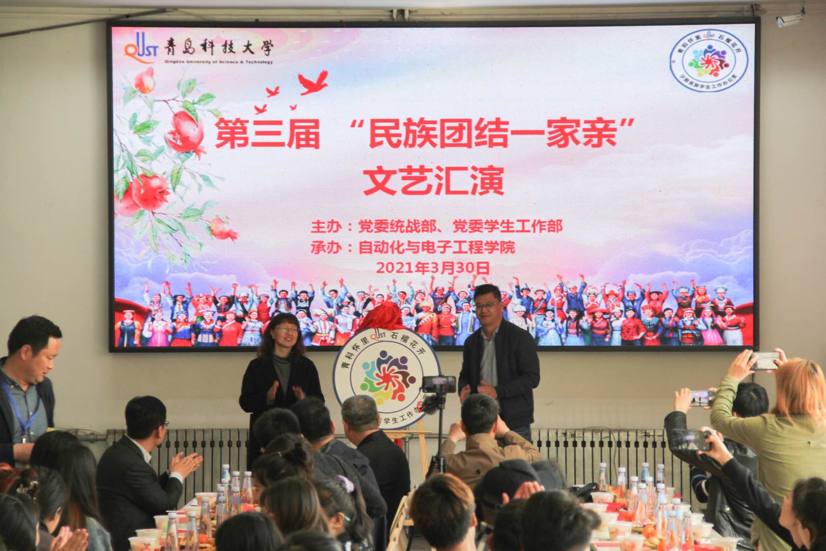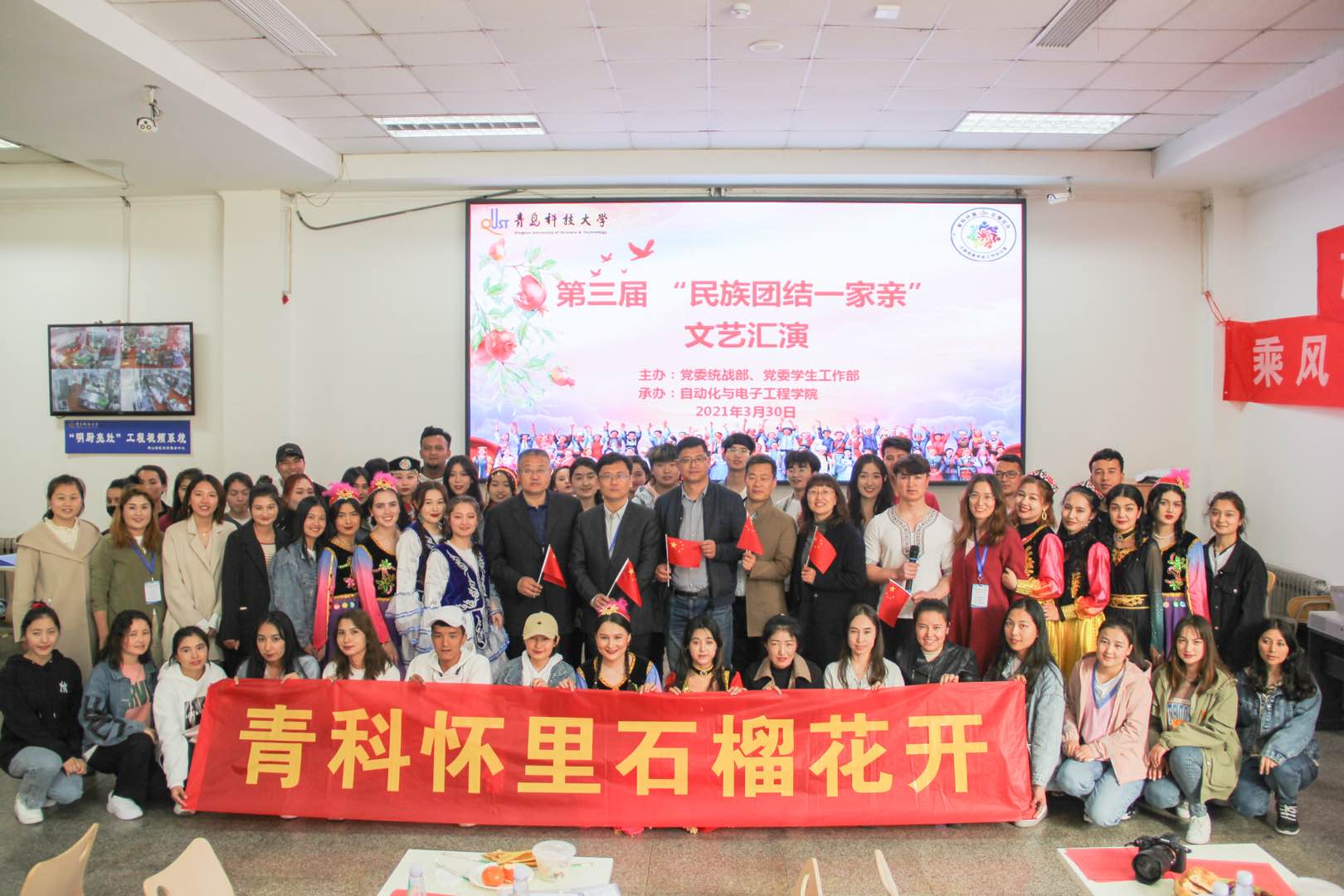 为庆祝中国共产党成立100周年,围绕铸牢中华民族共同体意识、促进学校各民族师生像石榴籽一样紧紧抱在一起,3月30日,“青科怀里·石榴花开”系列活动之“第三届‘民族团结一家亲’主题活动”在崂山校区举办。学校党委常委、党委统战部部长张洪坤出席活动,党委宣传部、党委学生工作部、后勤处、保卫处等部门负责人,部分学院党委副书记、辅导员参加了活动。