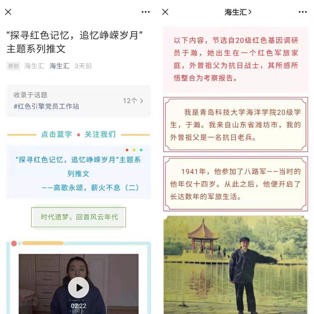 挖掘红色故事,淬炼思想。为进一步深度挖掘红色故事,学生会积极与“红色引擎”党站联动,联系红色家庭、红色宅基地调研员,对当地的红色故事、红色基因、红色足迹进行再调查,将调查内容整合成心得感悟。将于瀚、范馨文等同学家庭成员参加八路军、抗美援朝的事迹讲故事整理成宣讲故事,充分发挥其教育作用。