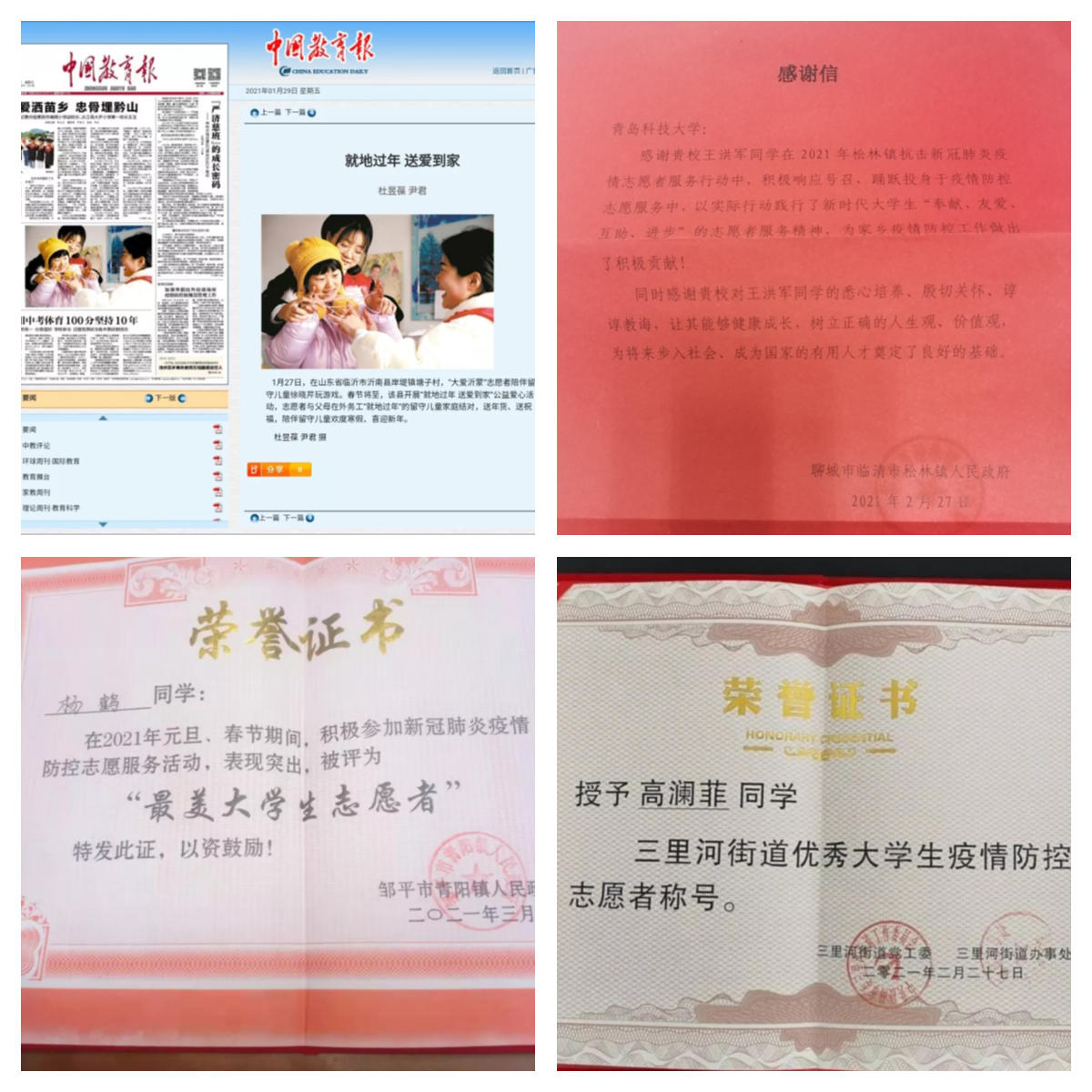 2021年寒假,高密校区学子勇于担当、主动作为、积极投身一线,协助所在地区和单位做好疫情防控工作和公益爱心活动。