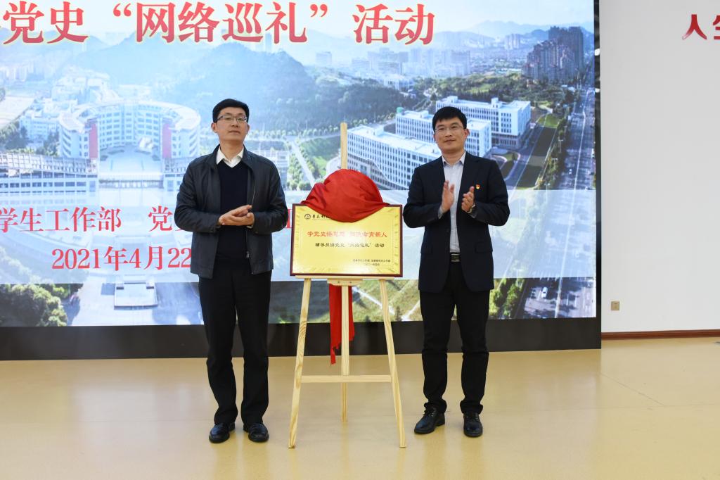 校团委书记毛常明、党委宣传部副部长李鲲鹏为辅导员讲党史“网络巡礼”活动揭牌。
