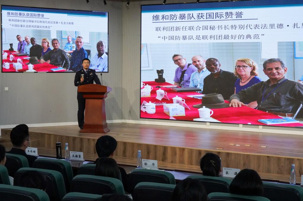 王瀚萱以青岛市海岸警察支队中韩所建立以来的故事为背景,通过人民警察勤勤恳恳为民服务的“小我”让在场师生见识到了他们忠诚履职、爱民为民的“大我”。杨帆结合2015年至2016年前往利比里亚共和国参与联合国维和任务的亲身经历和回到祖国后警察的工作,以旁征博引的宣讲给予了在场学生榜样的力量。两位警官精彩而又不失幽默的讲解引来了同学们一阵阵热烈的掌声。