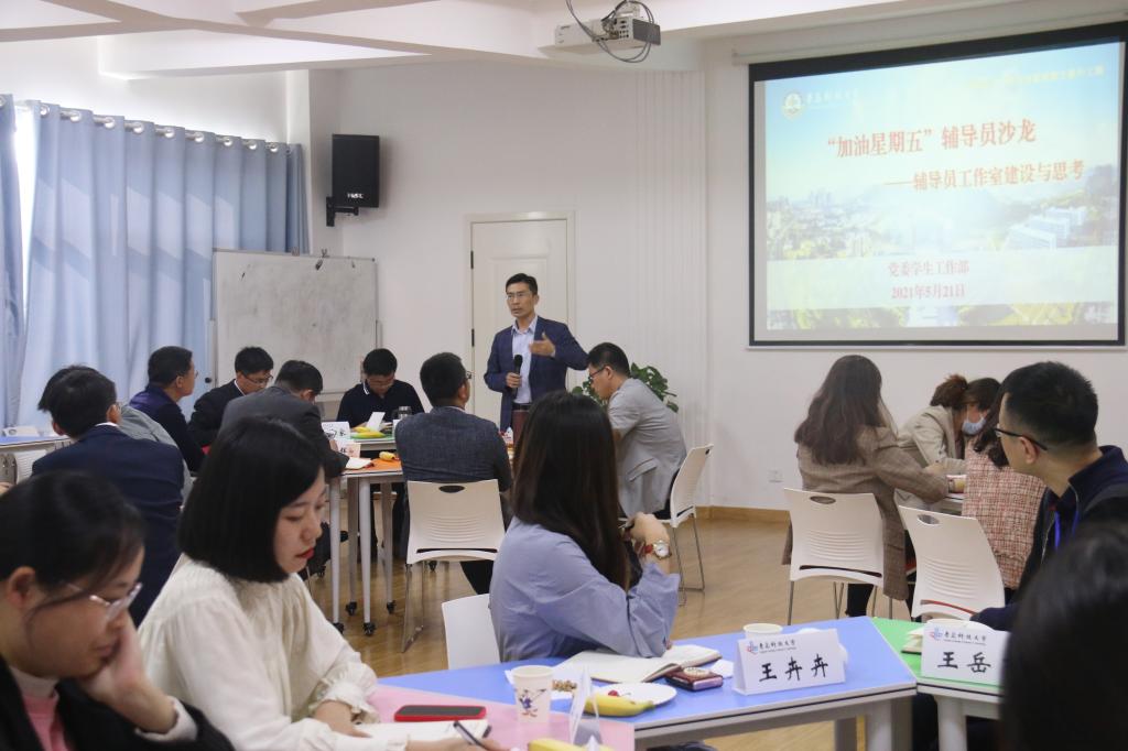5月21日下午,学校在崂山校区心理中心举办“加油星期五”辅导员沙龙,邀请山东省首批辅导员名师工作室主持人、机电工程学院党委副书记兼副院长肖强担任主讲嘉宾。党委学生工作部相关负责人、学校2021年立项建设的7个辅导员工作室主持人及成员代表46人参加活动。