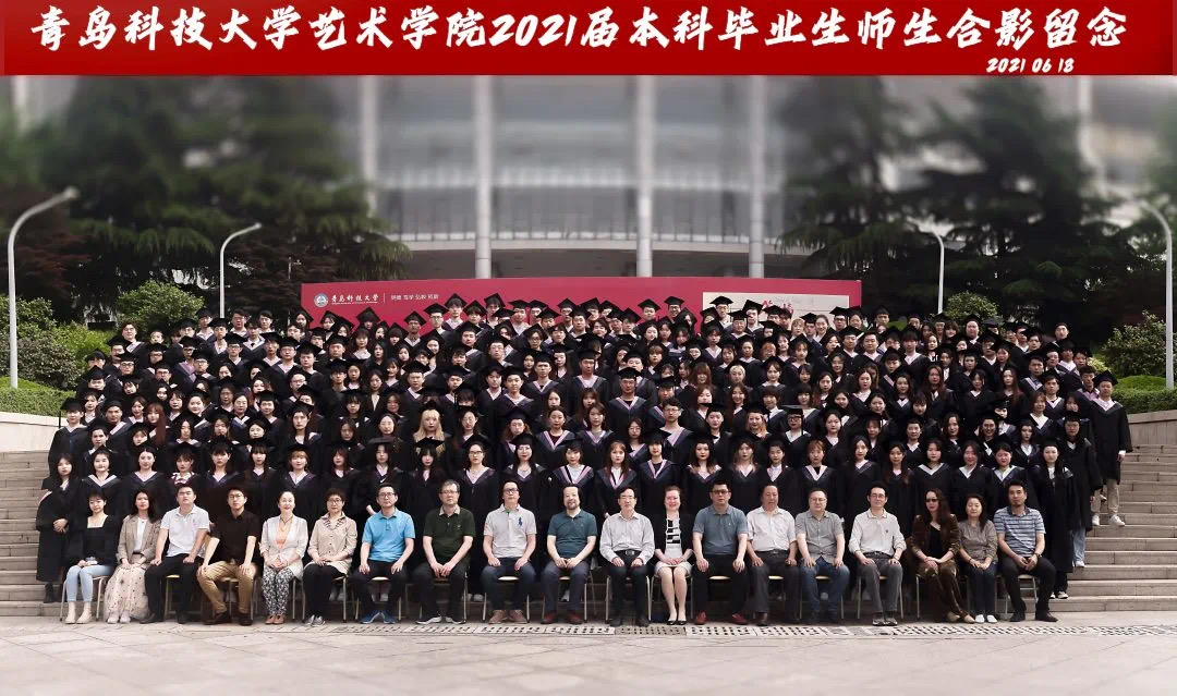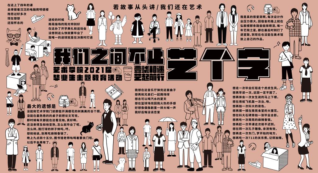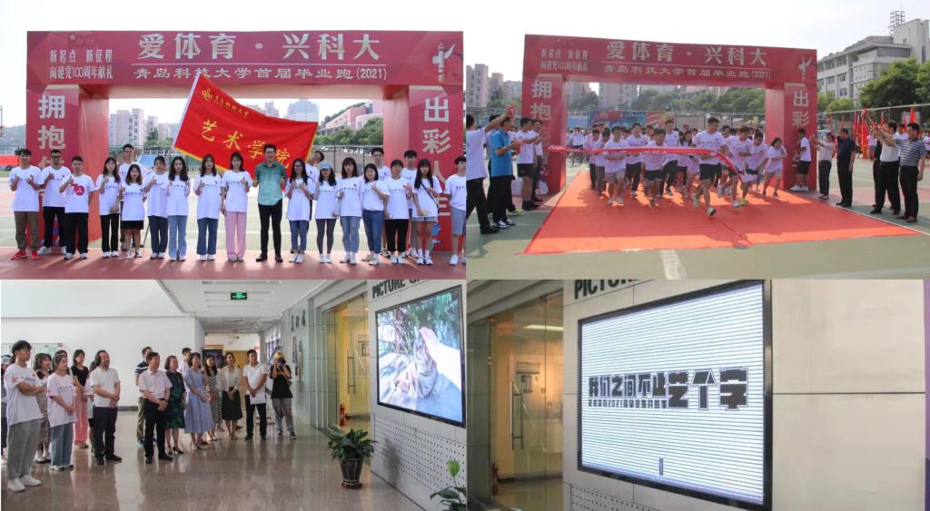 学院毕业生代表在参加“爱体育 兴科大”毕业跑活动,上好最后一节“体育课”后,集体于美术馆观影艺术学院2021届毕业生视频《我们之间不止艺个字》,视频以视觉传达专业一名毕业生的毕业设计为基础,融合科大元素,集合学生大学期间的精彩时光,通过帧幅跳跃的设计影屏回顾展示,随后师生在记录其青春年华的点滴喷绘展板前签名留念,主题绘板展现了毕业生与时代同心同向同行的风采。