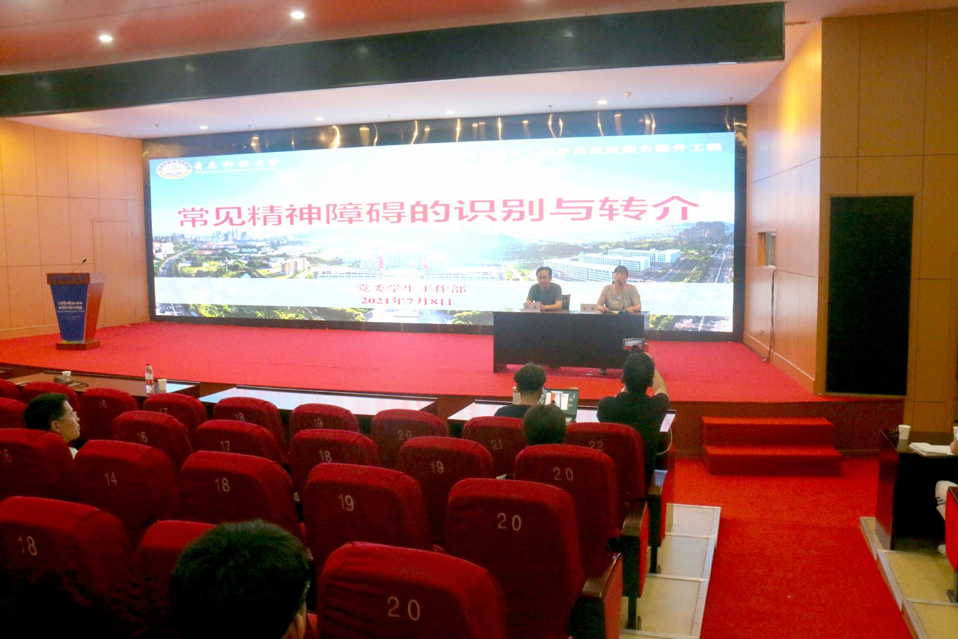 为进一步贯彻落实《高等学校学生心理健康教育指导纲要》、《高校思想政治工作质量提升工程实施纲要》等文件精神,健全心理危机预防和快速反应机制,切实提升辅导员对于心理问题的早期识别和危机预警能力,7月8日下午,学校邀请青岛市精神卫生中心副主任医师孙波做专题培训。培训由党委学生工作部副部长王丽主持。